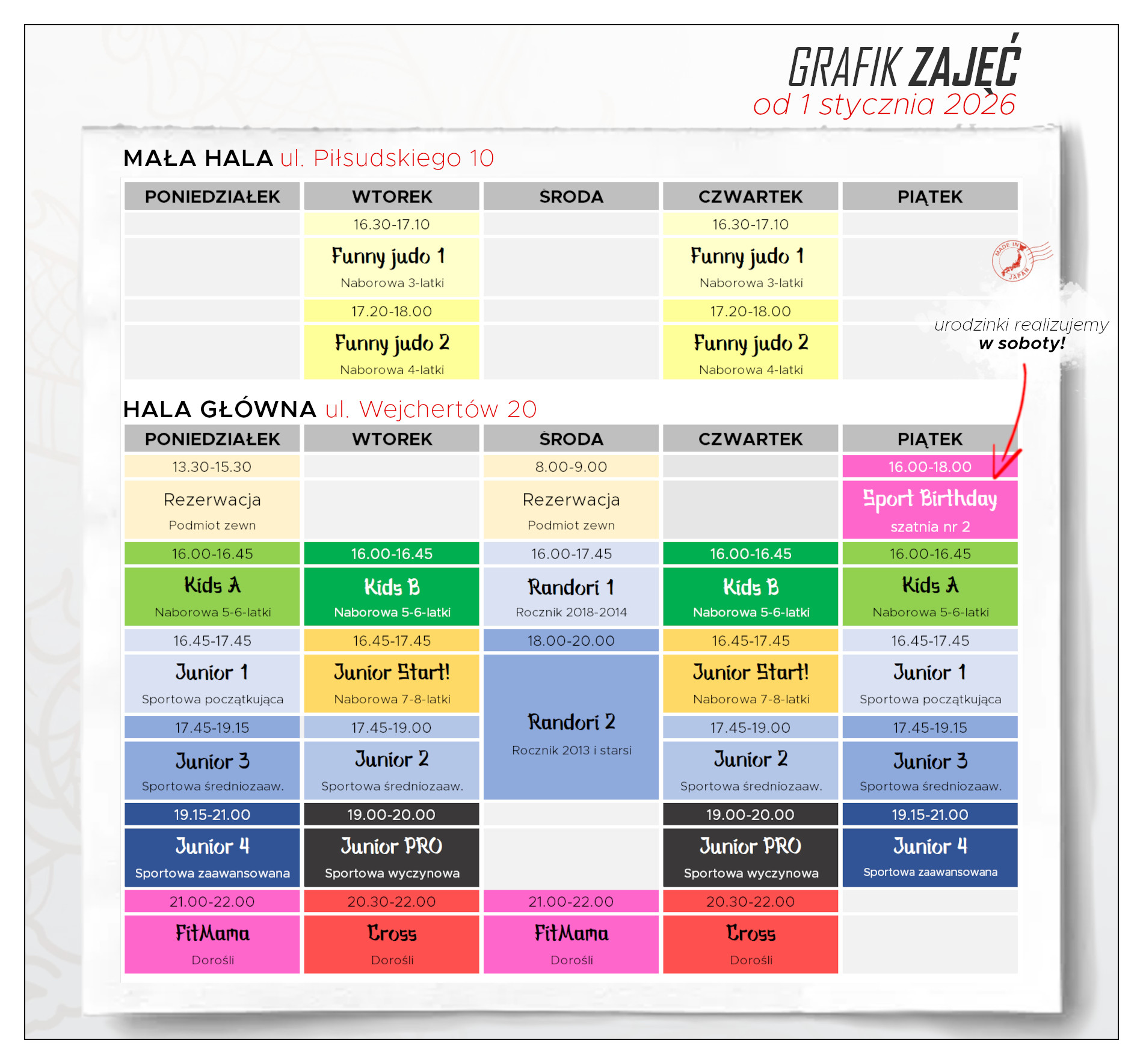 Na zajęcia prosimy przychodzić 15 minut przed rozpoczęciem treningu oraz korzystanie z szatni przypisanej danej grupie. Zawodnicy oczekują w szatni na wezwanie trenera na zajęcia. Dzieci mogą zostać pod okiem trenerów klubu do momentu odbioru przez rodzica (po wcześniejszym zgłoszeniu).